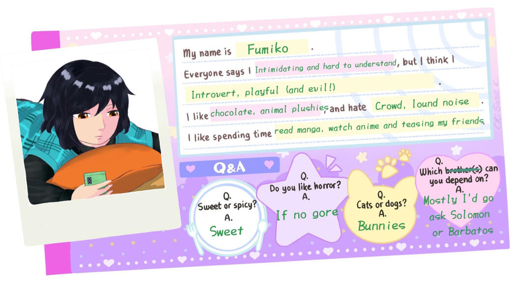 - Fumiko has a little crush on Levi, but she ignored the feeling and stay in FZ. Thinking that it's already fine in this way.- After the attic incident she didn't talk to Belphie much if it not really necessary. Until one day she snapped and had a big aggrument with him, but after that fight they finally feel less awkward with each other.- Fumiko can play chess but doesn't mean she's good at it. She only learns how to play it cause she think it's cool. (lol)- (wip)